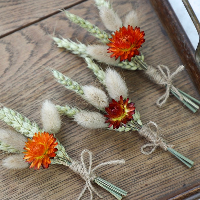 Beautiful buttonholes delicately put together by hand in the Shropshire Petals flower shed. Each buttonhole contains helichrysum, lagurus and wheat, all grown on the farm.
