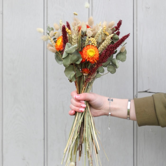 A beautiful burnt orange, burgundy and neutral tones dried flower Bouquet. Lovingly put together by hand in the Petal Shed, using only the highest quality dried flowers grown on the Shropshire Petals farm.