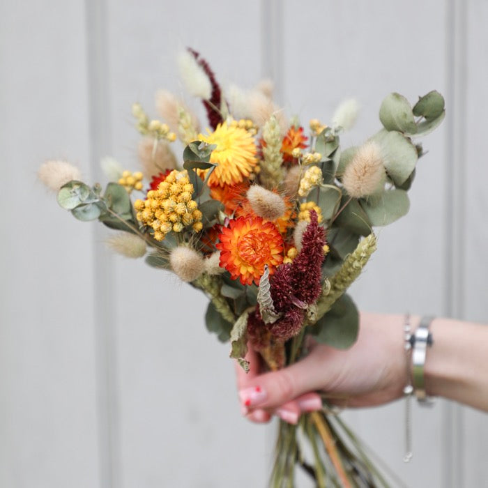 A bright and rich orange, burgundy and green Dried Flower Mini Bouquet, called Autumn Glow.