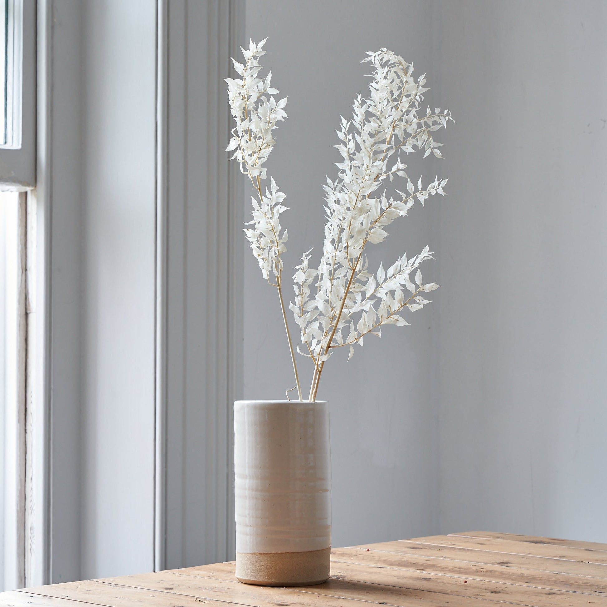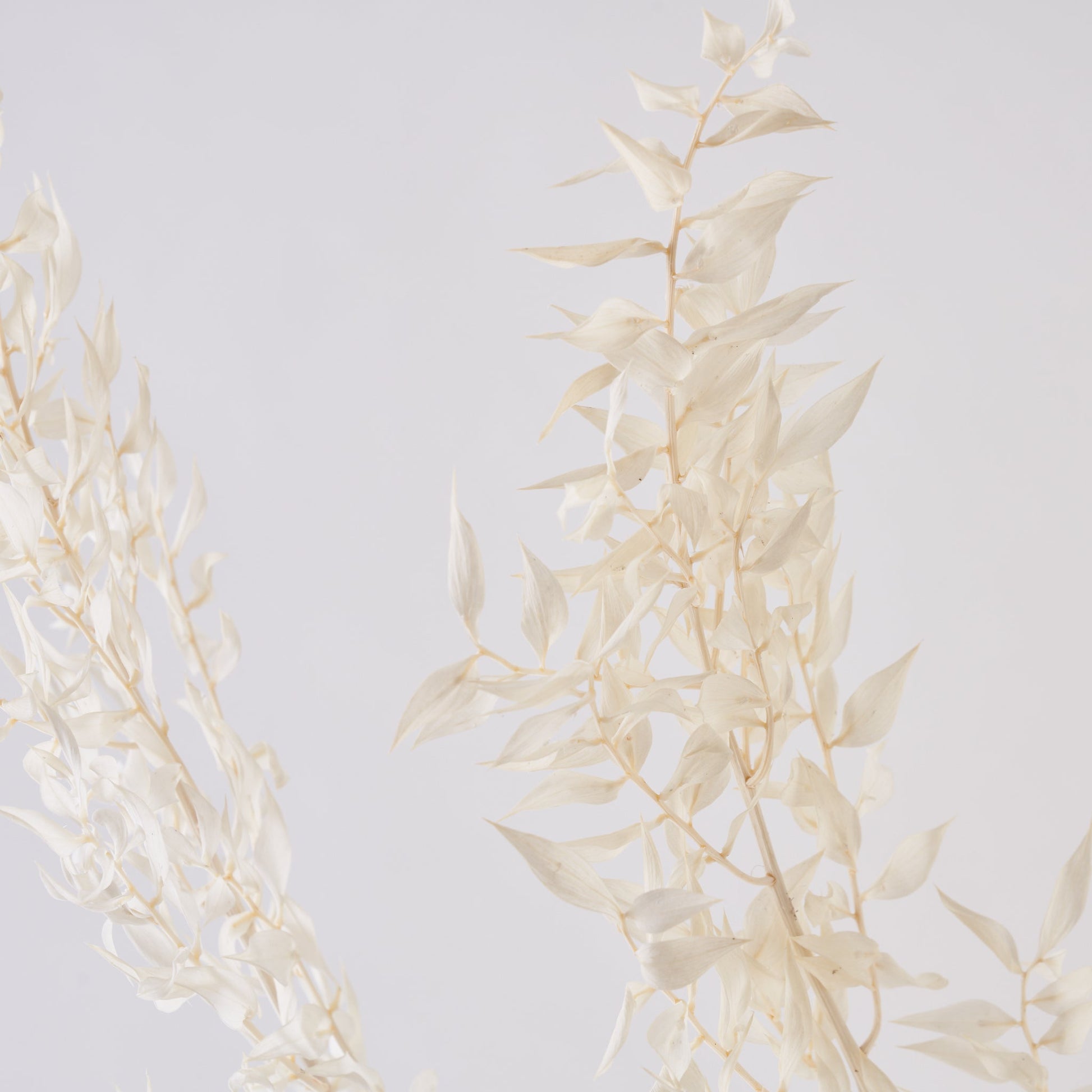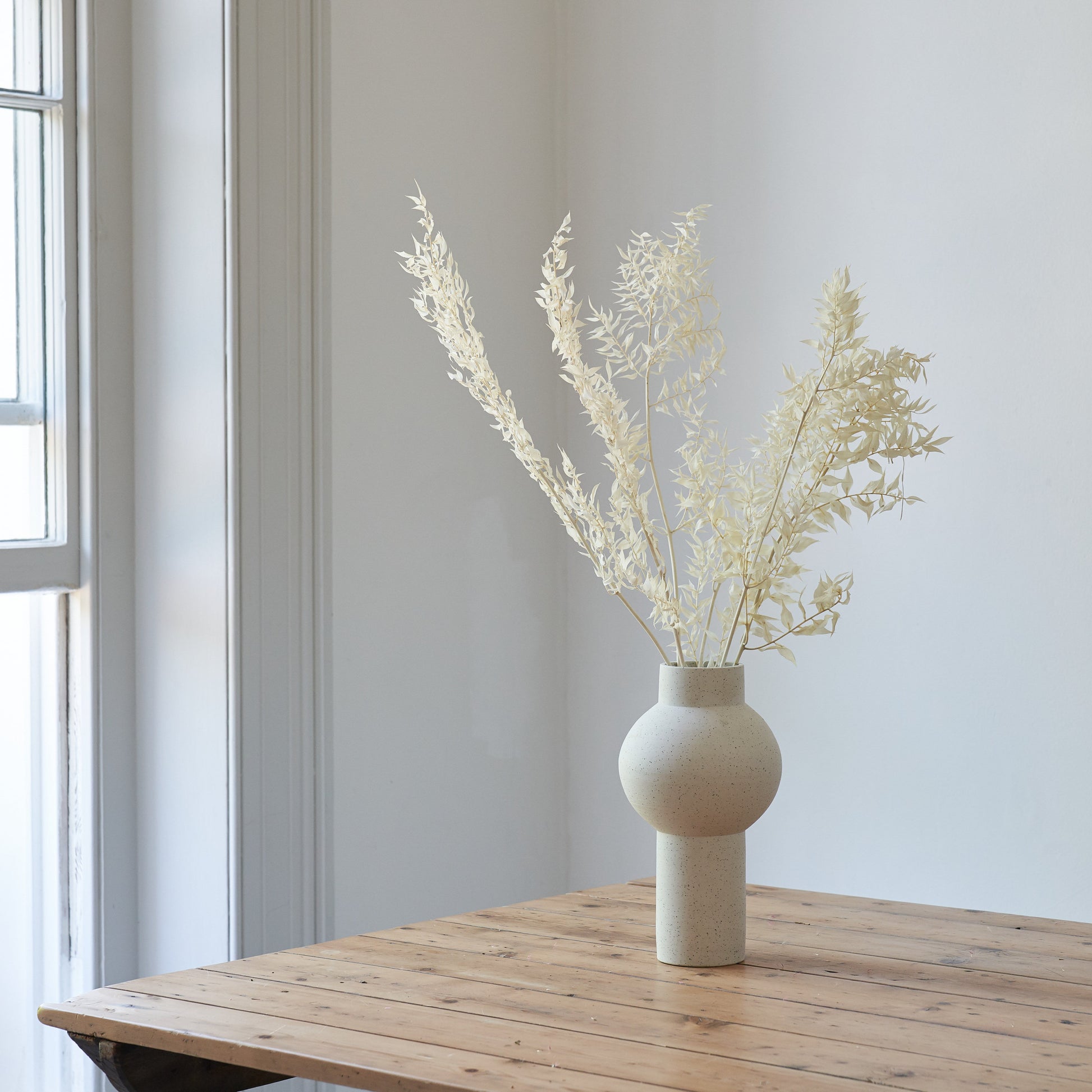 Bunch of preserved bleached ruscus. The ruscus is preserved meaning that it has the look and feel of fresh ruscus but will last forever. Available with or without the handcrafted contemporary clay vase.