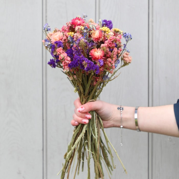 A bright and cheerful Wildflower Bouquet is made with dried flowers grown on our Shropshire farm. Featuring yellows, purple, apricot, greens and pink tones.